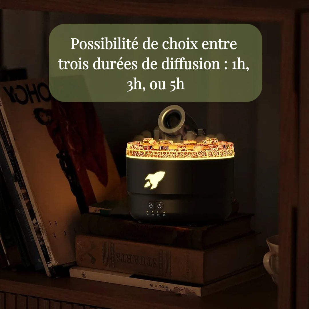 Minuteur pratique 1h, 3h, 5h : Le Vulcano™ vous offre la possibilité de choisir entre trois durées de diffusion : 1h, 3h, ou 5h, pour ajuster selon vos besoins, que ce soit pour une utilisation pendant la journée ou la nuit.